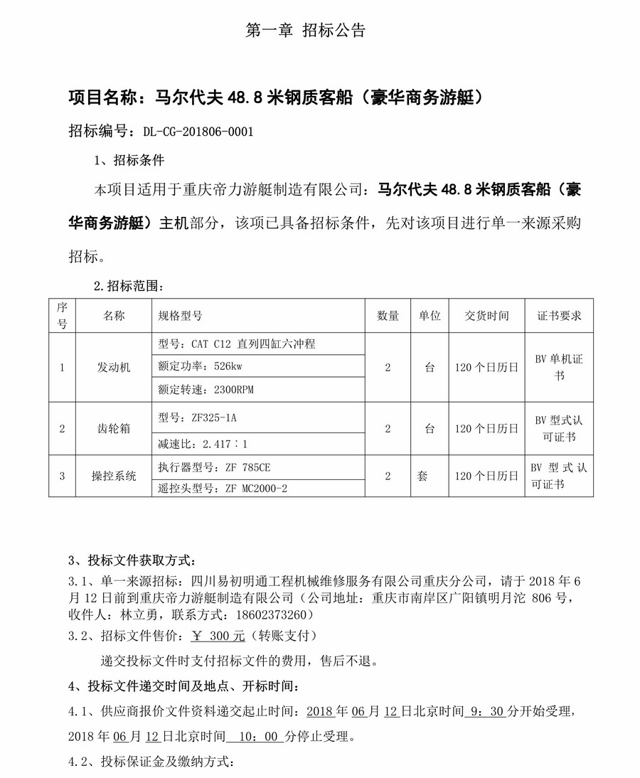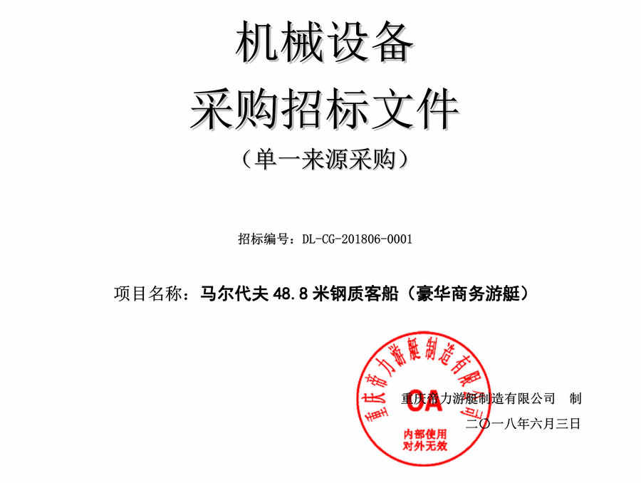 馬爾代夫48.8米鋼制客船(豪華商務(wù)游艇)機(jī)械設(shè)備采購(gòu)招標(biāo)