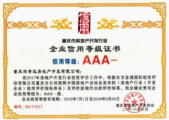 2018年6月,經(jīng)東方金誠國際信用評估有限公司重慶分公司的嚴(yán)格甄選,重慶洋世達(dá)房地產(chǎn)開發(fā)有限公司榮獲了重慶市房地產(chǎn)開發(fā)協(xié)會頒發(fā)的2018年7月至2020年6月的AAA-級信用等級證書。