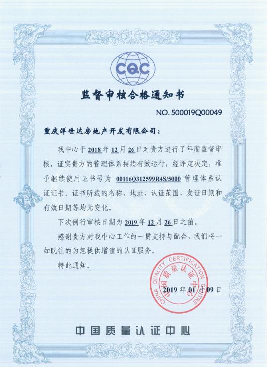 重慶洋世達(dá)房地產(chǎn)開發(fā)有限公司通過CQC2018年度監(jiān)督審核