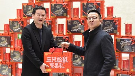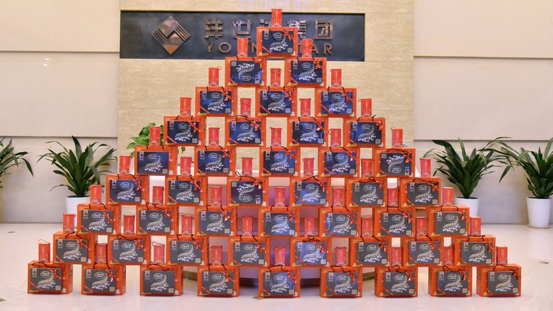 活動(dòng)現(xiàn)場(chǎng),年貨禮品堆積成了一面厚重的“祝福墻”。